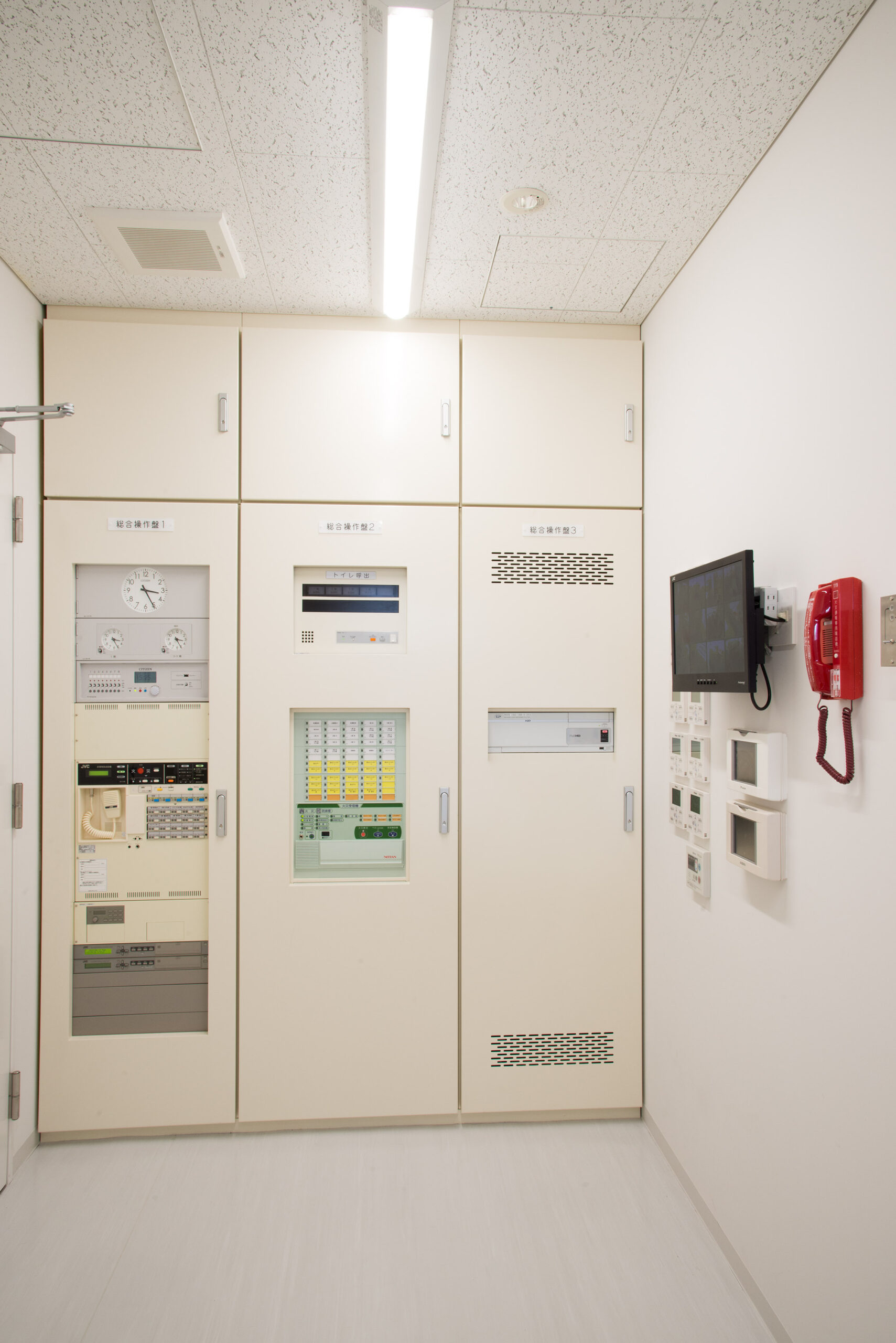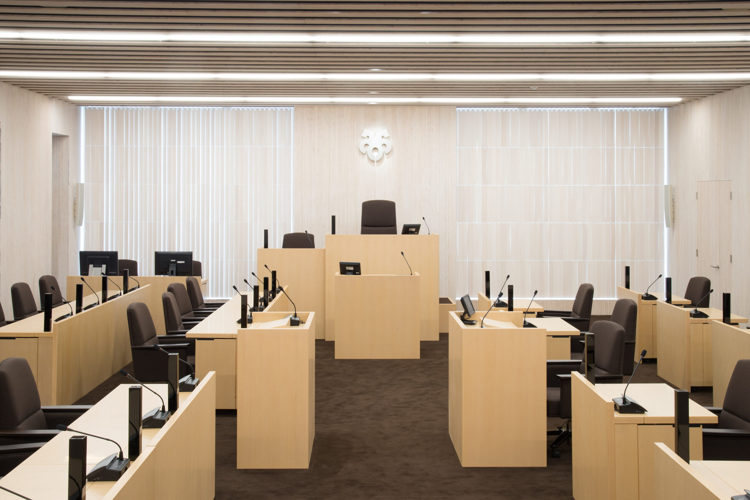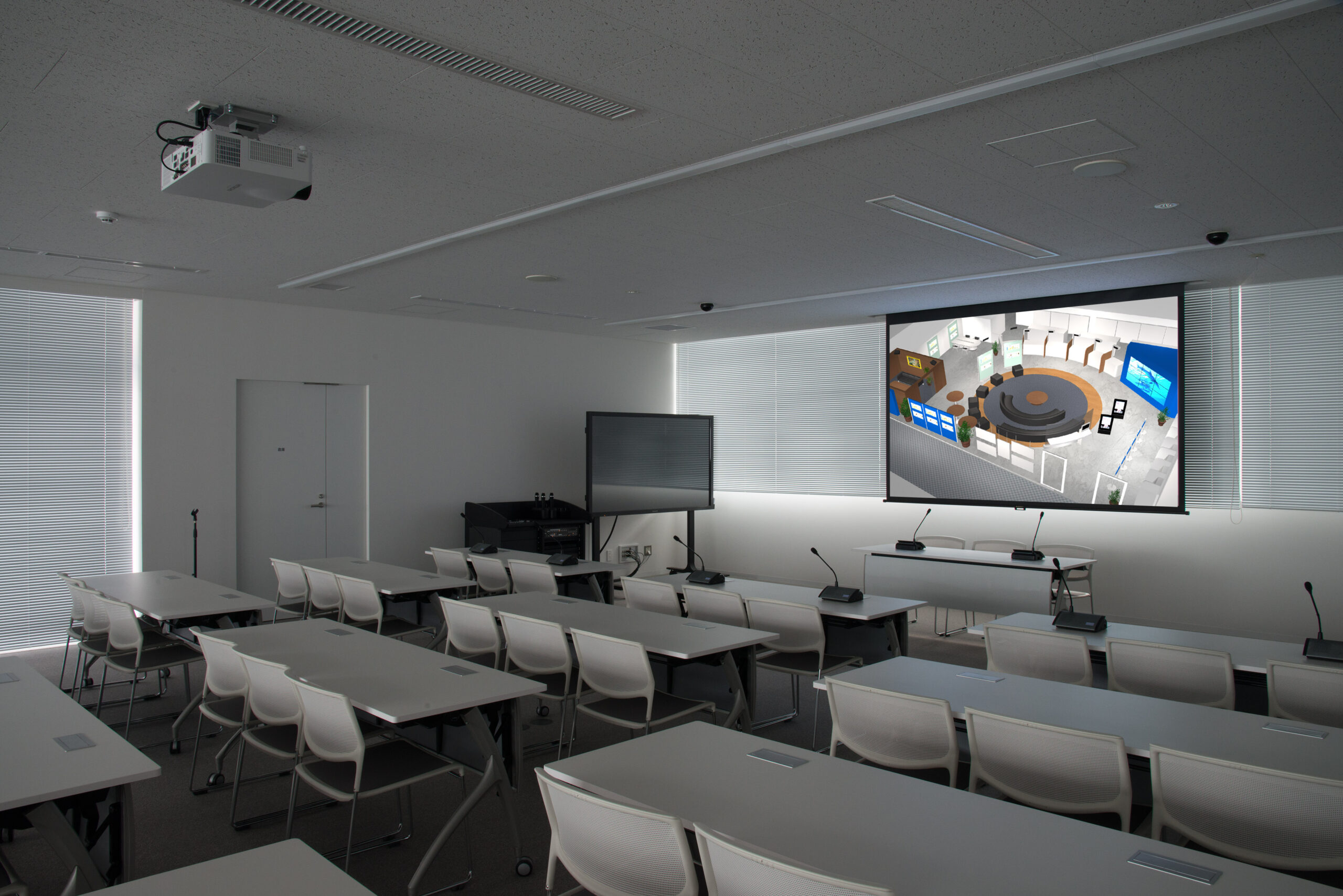 新庁舎建設にともない、議場、AV、防犯セキュリティーを導入 本会議場システム、放送設備、インターホン・トイレ呼出設備、 ITV設備、情報表示設備、電気時計設備、TV共聴設備、 自動火災報知設備を設置しました。