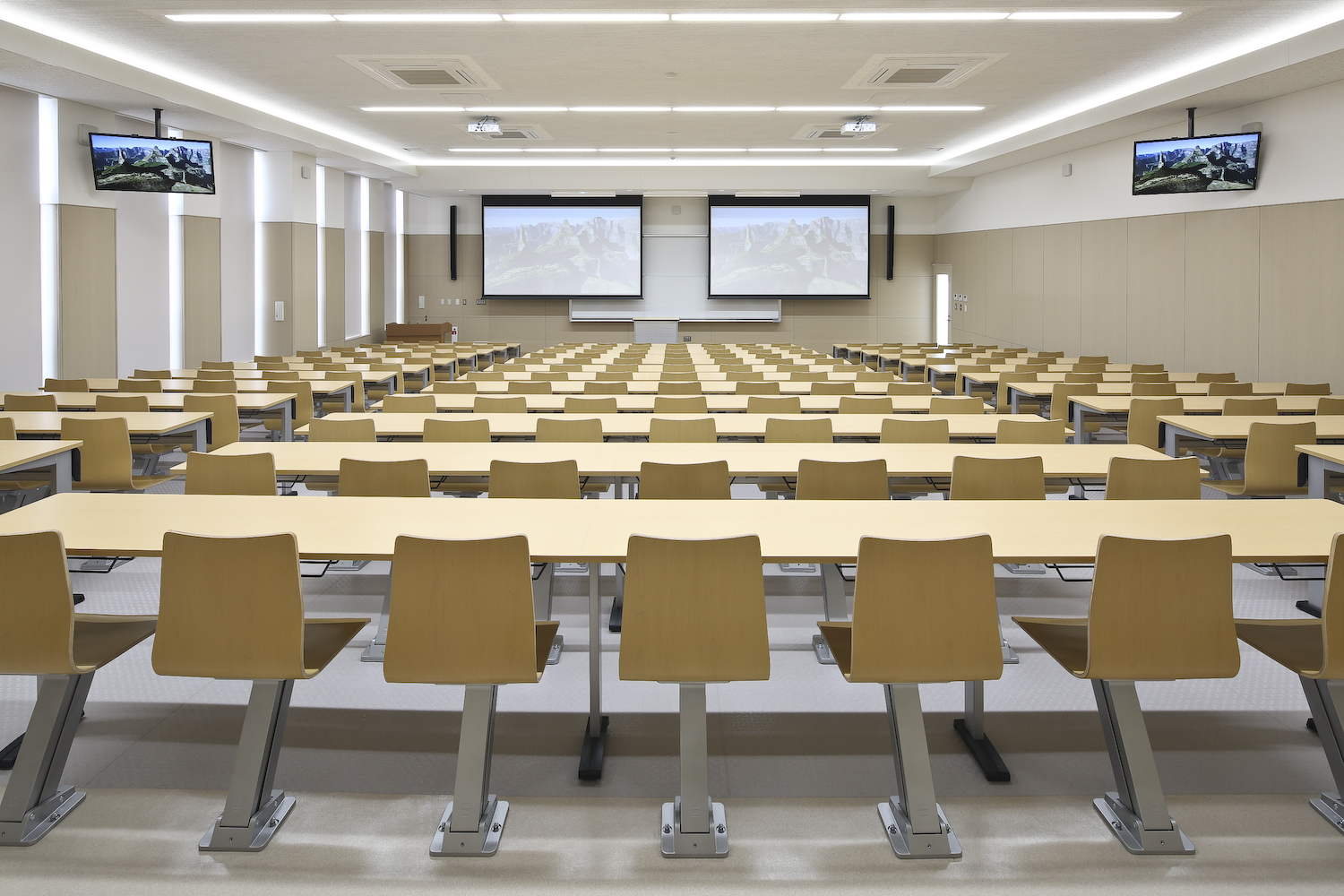 看護学部設立に伴い、AV設備、設備家具を導入 講堂AV設備、看護用什器備品、非常用放送設備、 自動火災報知設備を納入しました。